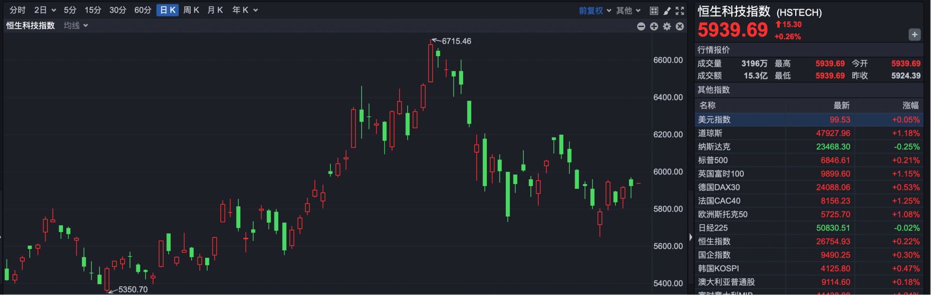 恒生科技指数报5939.69点,上涨15.30点,涨幅0.26%。