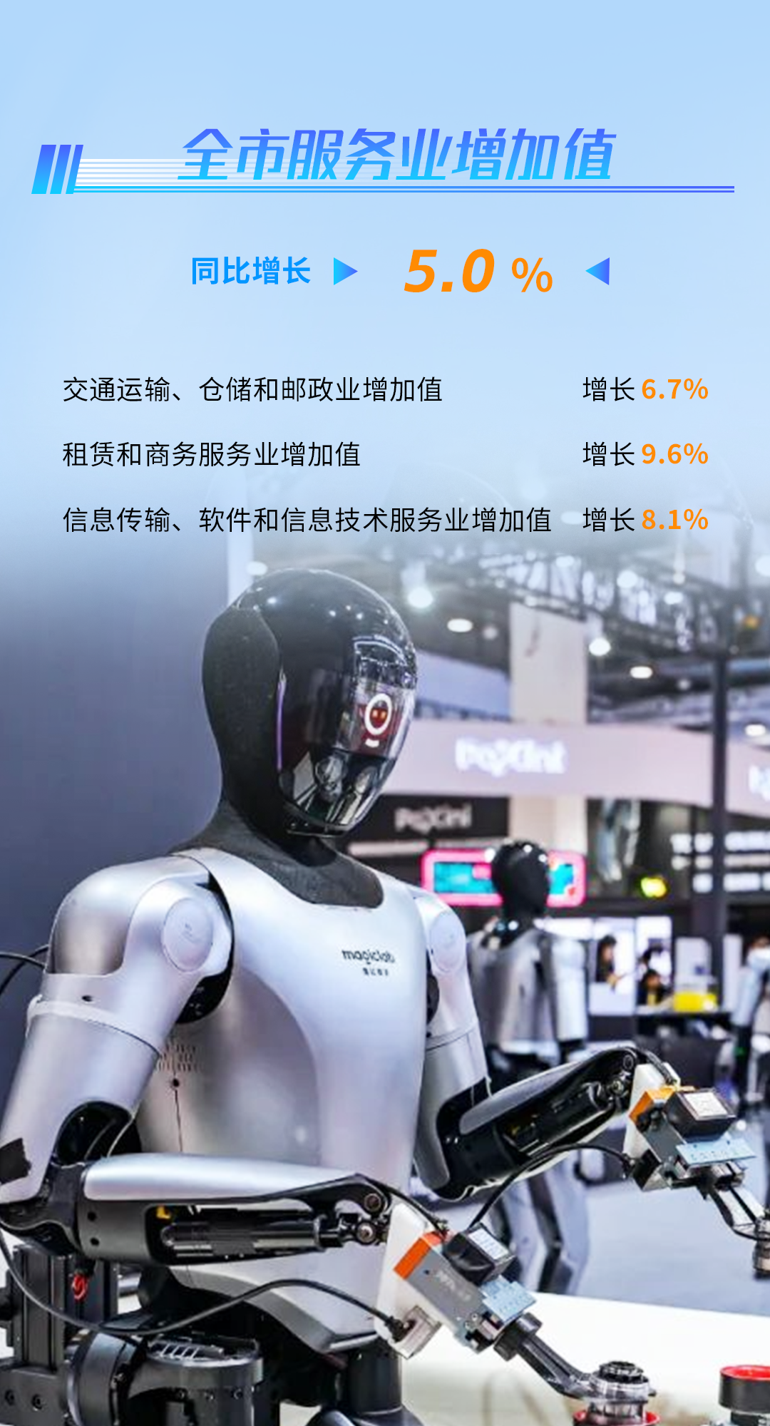 前三季度,全市服务业增加值同比增长5.0%。其中交通运输、仓储和邮政业增加值增长6.7%,租赁和商务服务业增加值增长9.6%,信息传输、软件和信息技术服务业增加值增长8.1%。1~8月全市规模以上服务业实现营业收入同比增长8.5%。其中商务服务业、互联网和相关服务、软件和信息技术服务业营业收入分别增长12.7%、10.3%和12.9%。生产生活性服务业稳定发展。生产性服务业营业收入增长8.2%。生活性服务业营业收入增长8.5%,其中居民出行、旅游游览和娱乐服务、养老服务等营业收入均实现两位数增长,分别增长23.6%、13.9%和12.5%。前三季度全市铁路、公路、水路货运周转量同比分别增长30.0%、9.2%和36.9%。全社会快递业务量30.5亿件,同比增长21.7%,快递业务收入239.1亿元,增长10.5%。