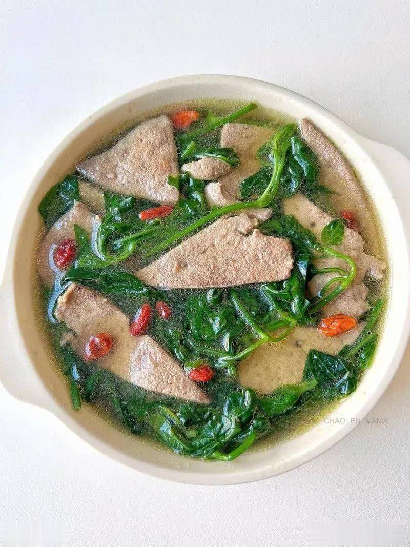 7. 完成:最后关火,捞出姜片和葱段,盛出汤品,热腾腾的枸杞叶猪肝汤就做好了。
