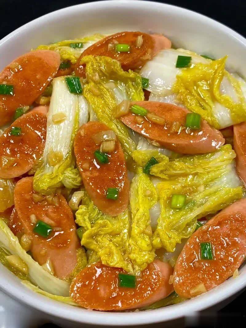 3、锅中底油,放入蒜末炒出香味,再放入娃娃菜翻炒几下,炒软后放入火腿肠翻炒均匀。