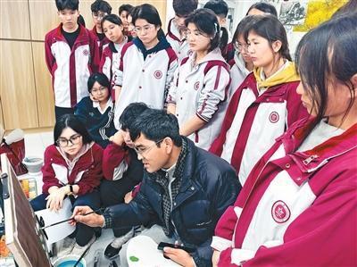 在阿瓦提县文化馆开展的“非遗进校园”活动中,乃比江指导阿瓦提县第八中学(鲁迅高中)学生画画。 受访者供图